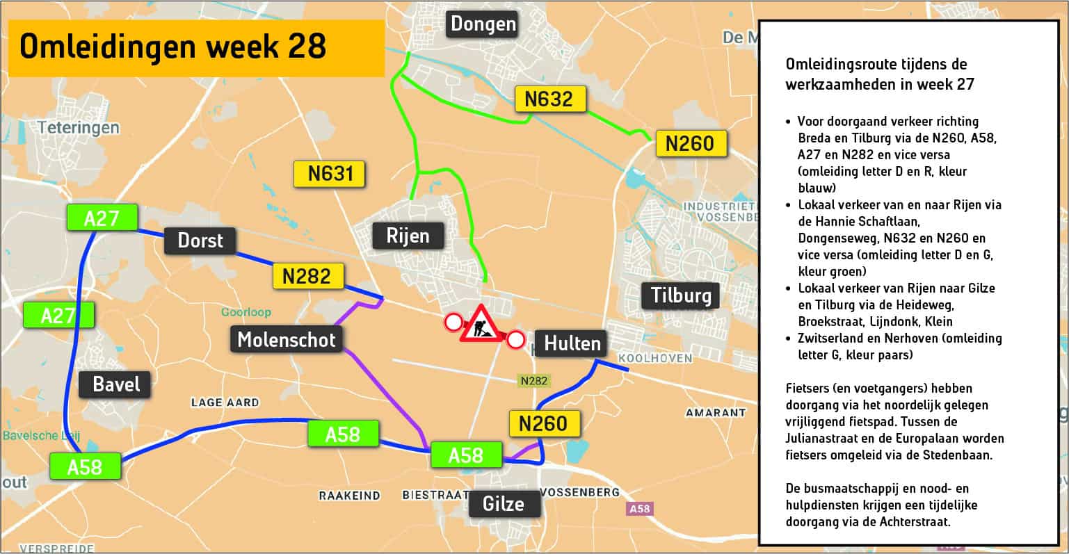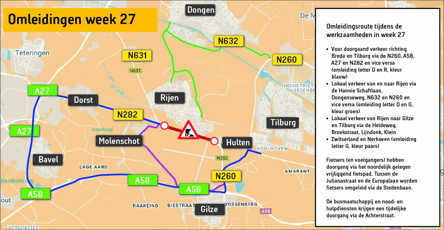 Van 29 juni 20.00 tot 11 juli 16.00 uur wordt Rijksweg N282 afgesloten van Hulten tot aan de Oosterhoutseweg (N631).