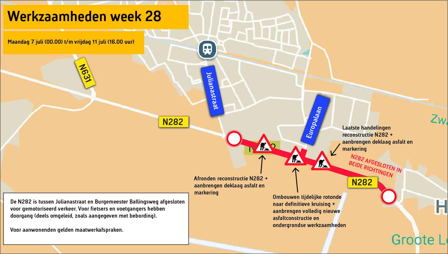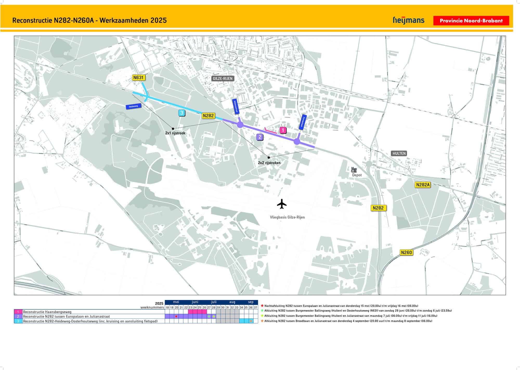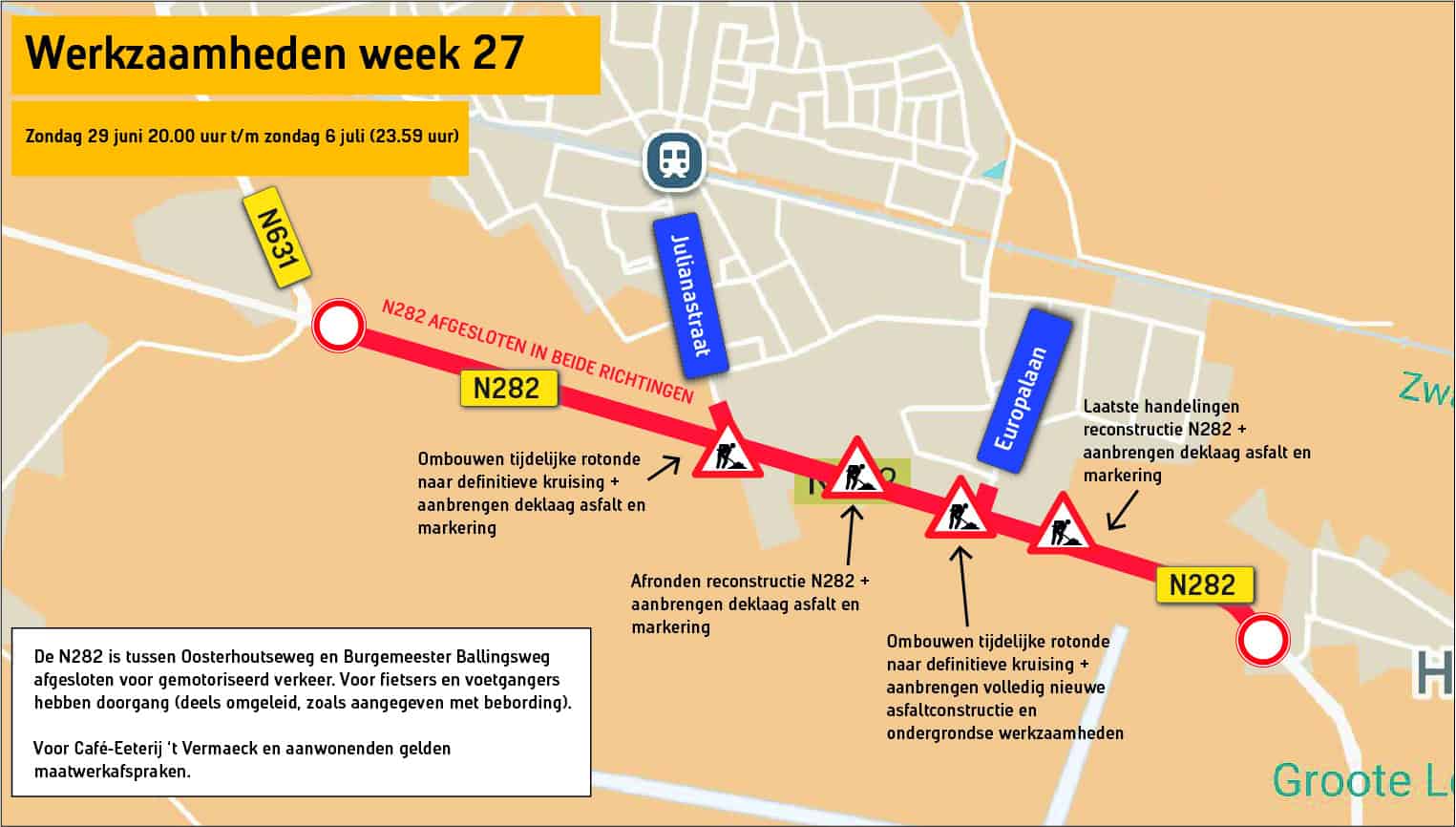 Tussen 30 juni en 12 juli wordt er veel werk verzet op de N282. In deze periode gaat Heijmans een gedeelte van de N282 verbreden naar 2 x 2 rijbanen. Ook leggen ze in dezelfde periode twee nieuwe kruispunten aan, op de kruising met de Europalaan en op de kruising met de Julianastraat. De tijdelijke rotondes worden weggehaald worden vervangen door kruispunten met slimme verkeerslichten. Om dit te kunnen doen wordt de N282 van 29 juni 20.00 tot 11 juli 16.00 uur afgesloten tussen Hulten en Rijksweg N631 Oosterhoutseweg. Hierover krijg je tijdens de inloopavond van 14 mei meer informatie.