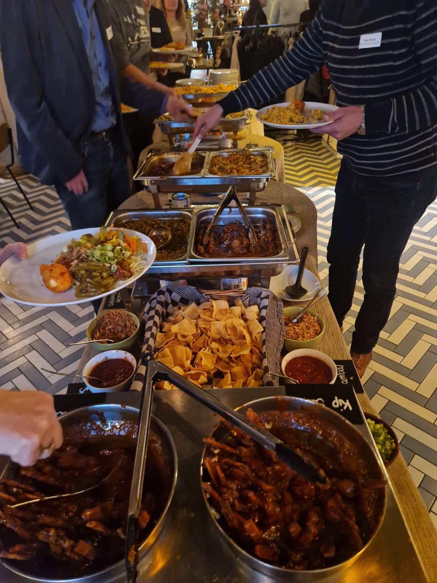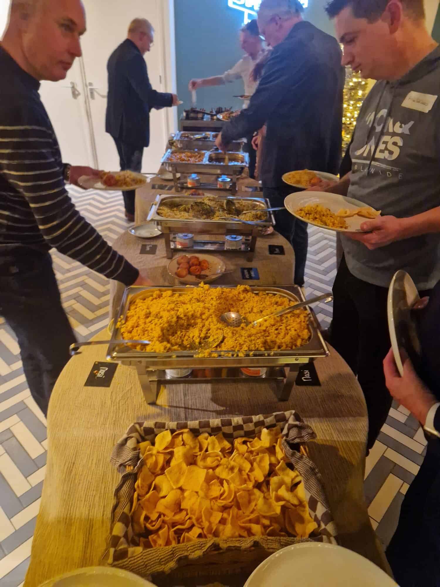 Daarna was het tijd om aan te schuiven bij het buffet. Geen klassiek stamppotbuffet dit keer, maar een smaakvolle “blauwe hap”. Even wennen voor sommigen, maar al snel bleek het een schot in de roos: de reacties waren enthousiast.