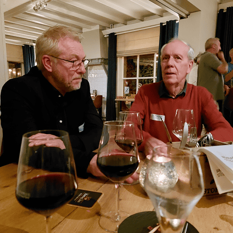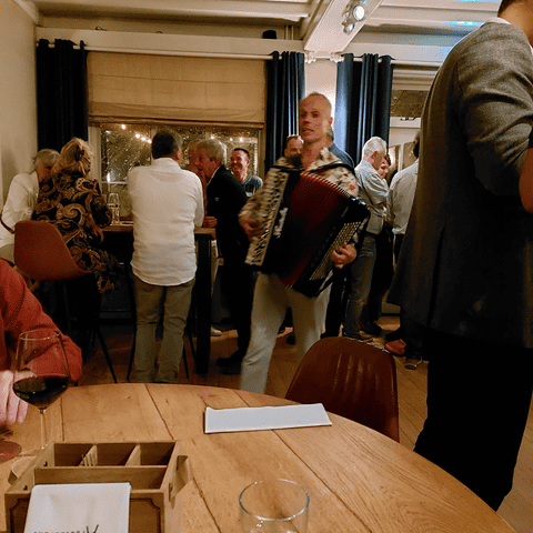 Daarna nam de keukenbrigade van Stad Parijs het over en serveerde een heerlijk walking dinner. Onze activiteitenbestuursleden, Daphne en Rob, hadden deze keer voor een muzikale omlijsting gekozen. Accordeonist Peter Faber begeleidde de smakelijke gerechten met een leuk muziekje. Het werd een bijzonder gezellige en zeer geslaagde avond!