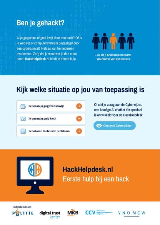 De eerste minuten na een (vermoedelijke) hack kunnen bepalend zijn voor de mogelijke gevolgen die een ondernemer ondervindt. Het is daarom belangrijk dat ondernemers weten waar ze terechtkunnen als ze denken slachtoffer te zijn van cybercriminaliteit: hiervoor is de HackHelpdesk in het leven geroepen. HackHelpdesk biedt ondernemers eerste hulp bij een hack. Door het geven van gericht advies en informatie kan slachtofferschap voorkomen worden of de gevolgen van een hack worden beperkt.